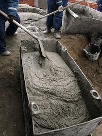 Рабочие на строительстве жилого дома у емкости с раствором бетона.