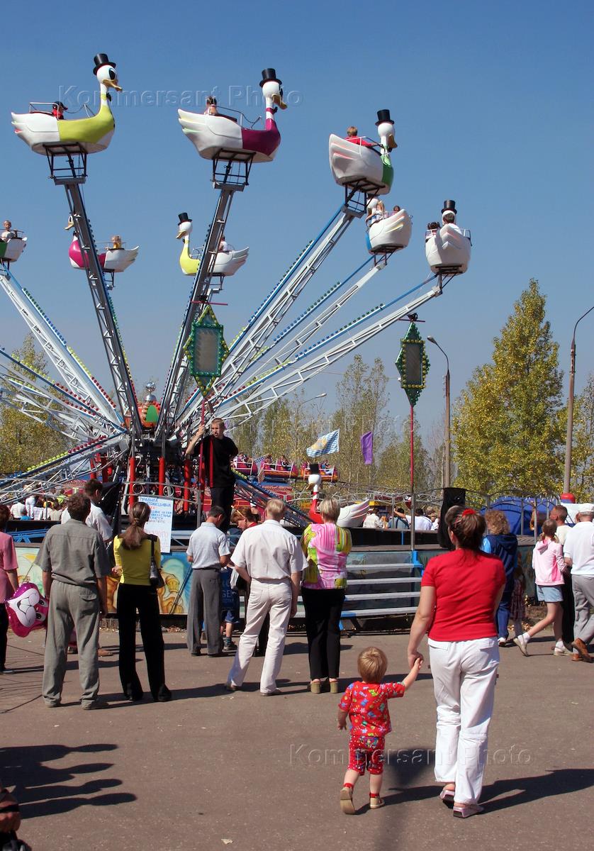 Жанровая фотография. Отдыхающие в парке аттракционов. Карусель с утятами.