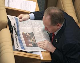 Депутат Государственной Думы России читает газету "КоммерсантЪ2 во время думского заседания.