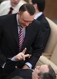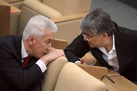 Член Комитета Государственной Думы России по бюджету и налогам Дмитрий Савельев (слева) во время думского заседания.