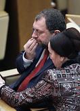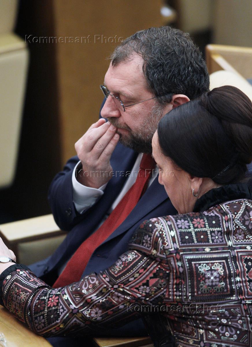 Председатель комитета Государственной Думы России по финансовому рынку Владислав Резник (слева) и член Комитета Государственной Думы России по труду и социальной политике Фарида Гайнуллина (справа) во время думского заседания.