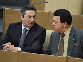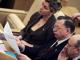Первый заместитель председателя Комитета Государственной Думы России по энергетике Валерия Драганов (слева) и член Комитета Государственной Думы России по информационной политике, информационным технологиям и связи Иосиф Кобзон (справа) во время думского заседания.