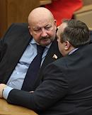 Заместитель председателя Комитета Государственной Думы (ГД) России по образованию Гаджимет Сафаралиев (слева) и первый заместитель председателя Комитета ГД России по делам ветеранов Франц Клинцевич (справа) во время думского заседания.