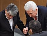 Член Комитета Государственной Думы (ГД) России по безопасности Отари Аршба (в центре) и член Комитета ГД России по собственности Владимир Пехтин (справа) на заседании Госдумы.