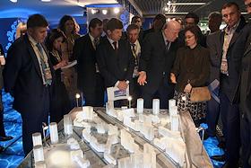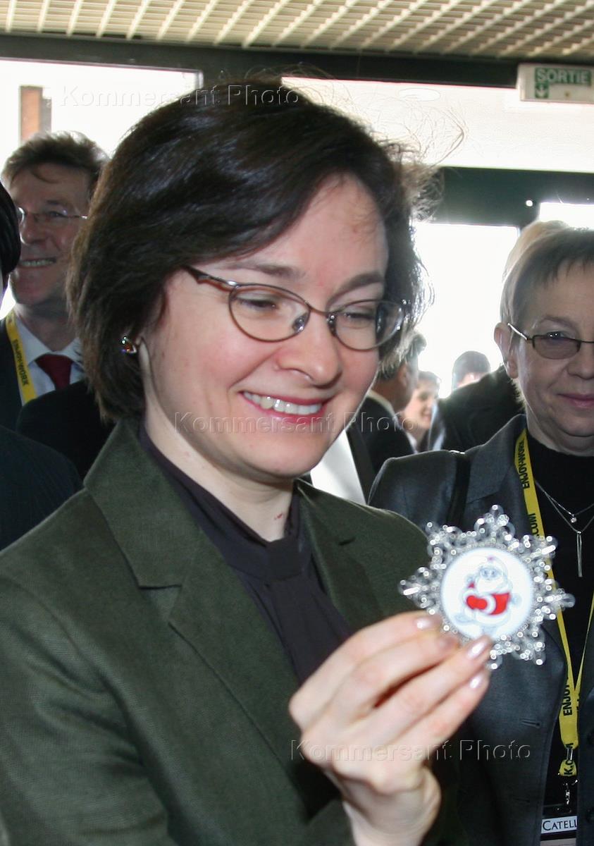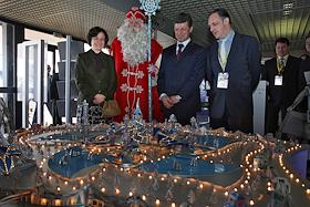 Международная инвестиционная выставка недвижимости "MIPIM 2008". Министр экономического развития и торговли России Эльвира Набиуллина у макета проекта "Резиденция Деда Мороза" стенда Вологодской области в павильоне "Регионы России".