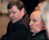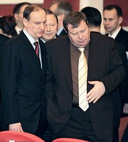 Министр юстиции России Владимир Устинов (слева) и директор Федеральной службы безопасности России Николай Патрушев (справа) на торжественном собрании, посвященном 85-летию создания Верховного суда. Собрание состоялось в здании Верховного суда России.