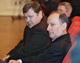 Директор Федеральной службы безопасности России Николай Патрушев (слева) и министр юстиции России Владимир Устинов (справа) на торжественном собрании, посвященном 85-летию создания Верховного суда. Собрание состоялось в здании Верховного суда России.
