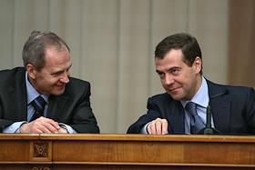 Первый заместитель председателя Правительства России, избранный Президент России Дмитрий Медведев (слева) и председатель Верховного суда России Вячеслав Лебедев (справа) на торжественном собрании, посвященном 85-летию создания Верховного суда. Собрание состоялось в здании Верховного суда России.