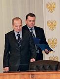 Первый заместитель председателя Правительства России, избранный Президент России Дмитрий Медведев (справа) на торжественном собрании, посвященном 85-летию создания Верховного суда. Собрание состоялось в здании Верховного суда России.