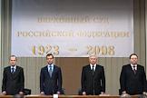 Председатель Конституционного суда России (КС РФ) Валерий Зорькин (слева), первый заместитель председателя Правительства России, избранный Президент России Дмитрий Медведев (второй слева), председатель Верховного суда России Вячеслав Лебедев (второй справа) и председатель Высшего Арбитражного суда России Антон Иванов (справа) на торжественном собрании, посвященном 85-летию создания Верховного суда. Собрание состоялось в здании Верховного суда России.