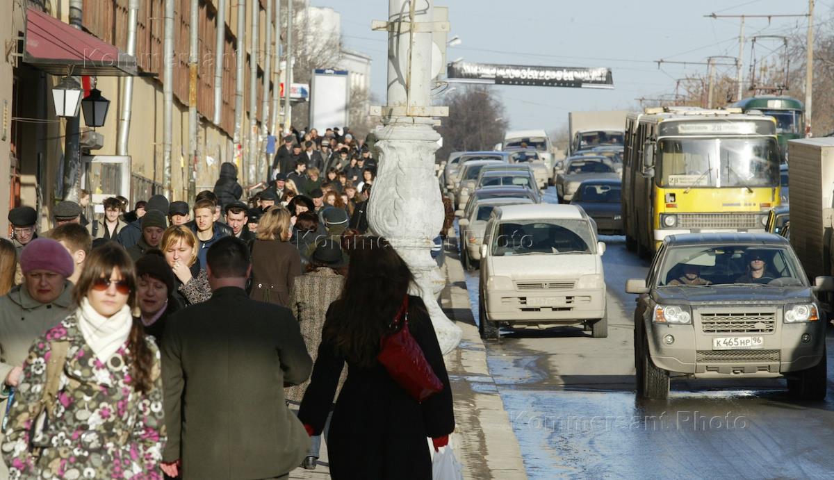 Пешеходы и автотранспорт во время час-пик на проспекте Ленина в Екатеринбурге.