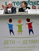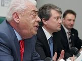 Президент банка "Возрождение" Дмитрий Орлов (слева), первый заместитель председателя правительства Подмосковья Игоря Пархоменко (в центре) и Олег Меркулов генеральный директор ООО "Росгосстрах-Столица" (спрва) во время пресс-конференции посвященной первому совместному социальному проекту "Росгосстраха" и банка "Возрождение". Пресс-конференция прошла в центральном офисе агентства "Интерфакс".