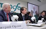 Президент банка "Возрождение" Дмитрий Орлов (слева), первый заместитель председателя правительства Подмосковья Игоря Пархоменко (второй спрва)) и Олег Меркулов генеральный директор ООО "Росгосстрах-Столица" (слева) во время пресс-конференции посвященной первому совместному социальному проекту "Росгосстраха" и банка "Возрождение". Пресс-конференция прошла в центральном офисе агентства "Интерфакс".