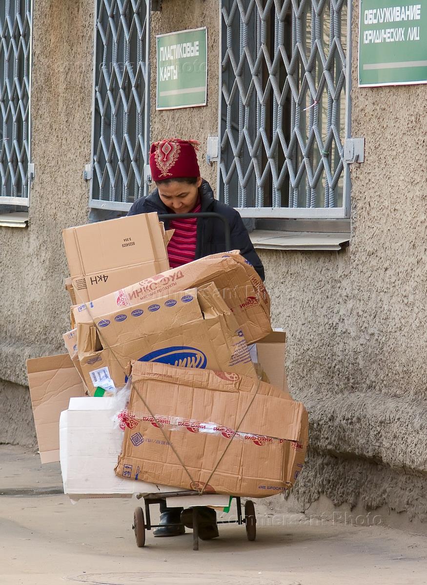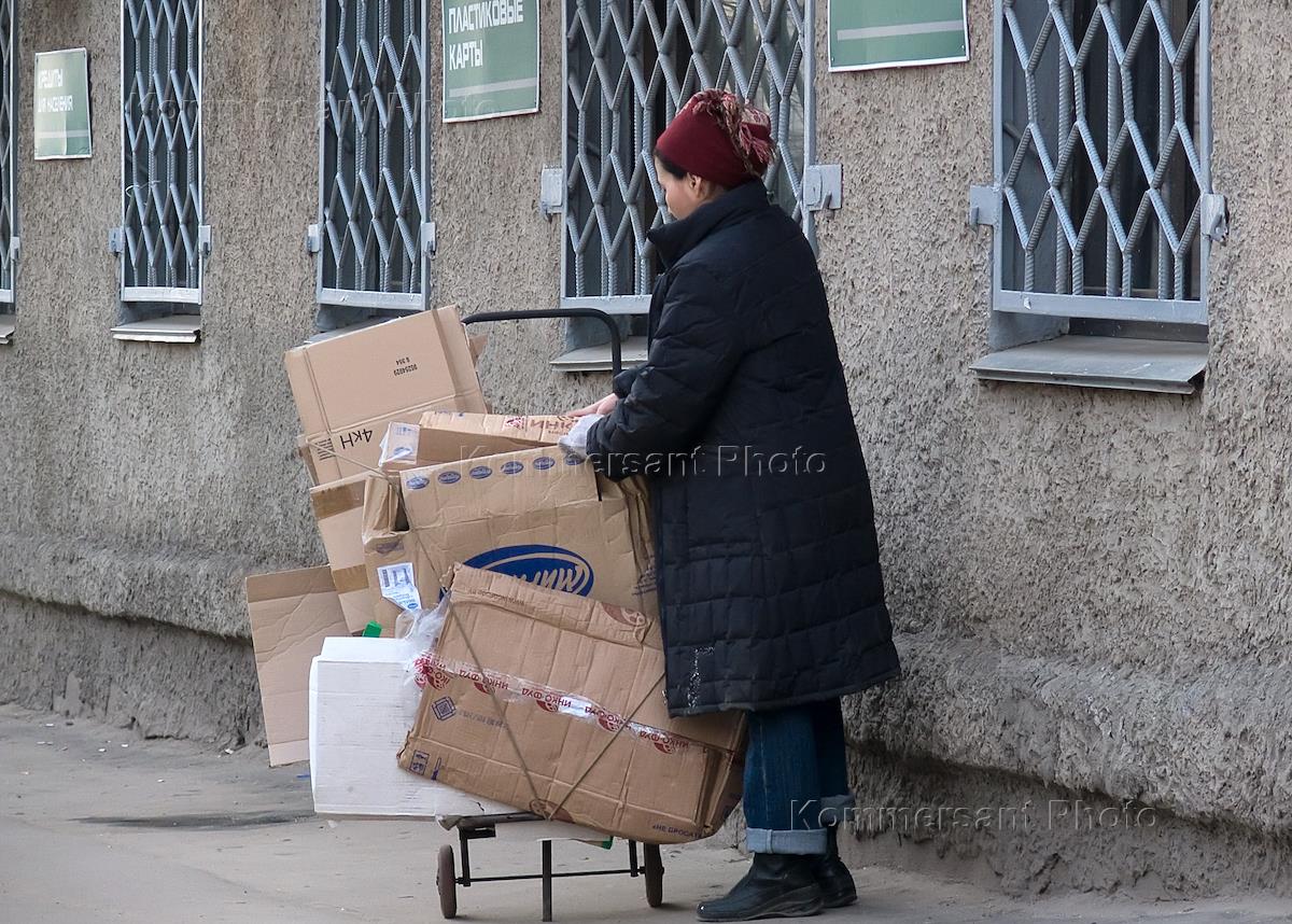 Женщина везет тележку с коробками из картона в пункт приема вторичного сырья.
