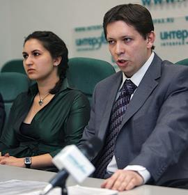 Адвокаты компании Boily System ltd. Екатерина Ромм (слева) и Юрий Николаев (справа) на пресс-конференции "Ответ компании Boily System ltd. на обвинения У.Браудера в хищении фонда Hermitage трех российских фирм". Пресс-конференция прошла в агентстве "Интерфакс".