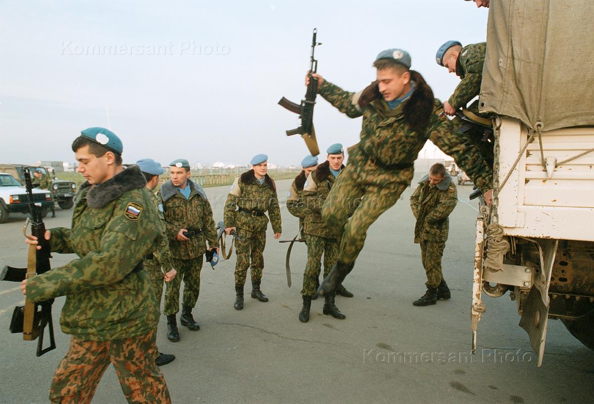 Russian paratroopers taking part in a peace keeping mission jump out of their lorry.