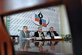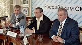 Директор департамента информационной политики компании "Майкрософт рус" Евгений Данилов (слева), генеральный секретарь Союза журналистов России Игорь Яковенко (в центре) и заместитель руководителя Федеральной службы по надзору в сфере массовых коммуникаций связи и охраны культурного наследия Сергей Ситников (справа) во время пресс-конференции на тему: "Российским СМИ – лицензирование ПО". Пресс-конференция прошла в Центральном Доме журналиста.