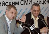 Директор департамента информационной политики компании "Майкрософт рус" Евгений Данилов (слева) и генеральный секретарь Союза журналистов России Игорь Яковенко (справа) во время пресс-конференции на тему: "Российским СМИ – лицензирование ПО". Пресс-конференция прошла в Центральном Доме журналиста.