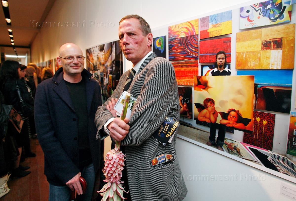 Критик Павел Гершензон (слева) и искусствовед Аркадий Ипполитов (справа) во время церемонии открытия выставки фотографа Юрия Молодковца "THE BEST OF FINE ARTS" в галерее Марии Гисич.