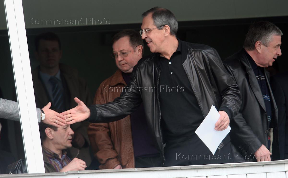 Чемпионат России по футболу. Футбольный тренер Георгий Ярцев (слева), заместитель председателя Правительства России Александр Жуков (вторая слева), председатель Счетной палаты России Сергей Степашин (справа) и министр иностранных дел России Сергей Лавров (второй справа) на трибуне во время матча между командами "Динамо" (Москва) - "Спартак" (Москва) (4:3). Матч прошел на стадионе "Динамо".