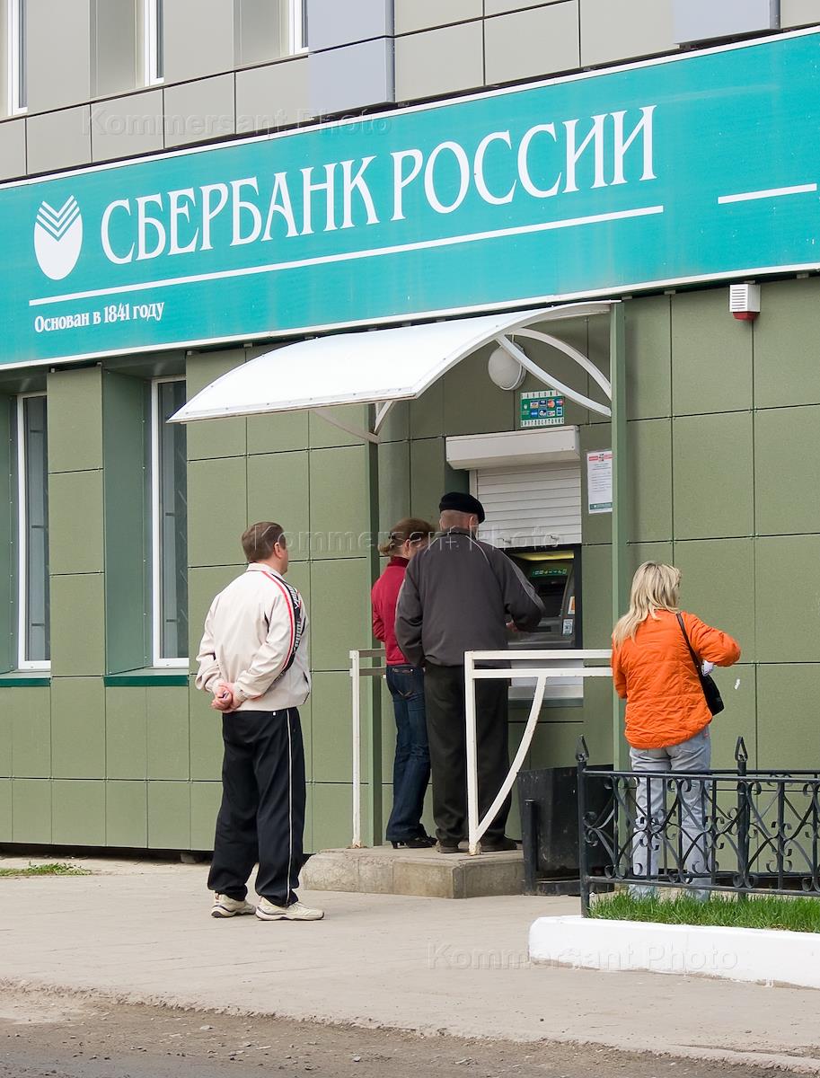 Банкомат Сбербанк. Люди стоят в очереди. Мужчина снял деньги и отходит от банкомата.