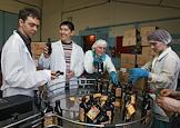 Совладельцы компании "Виртекс-food": генеральный директор Владимир Лим (второй слева) и исполнительный директор Сергей Малков (слева) на заводе компании. Конвейер по упаковке коптильной приправы "Жидкий Дым".