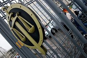 Рабочий ремонтирует световую вывеску ресторана "Макдоналдс" (McDonald`s).