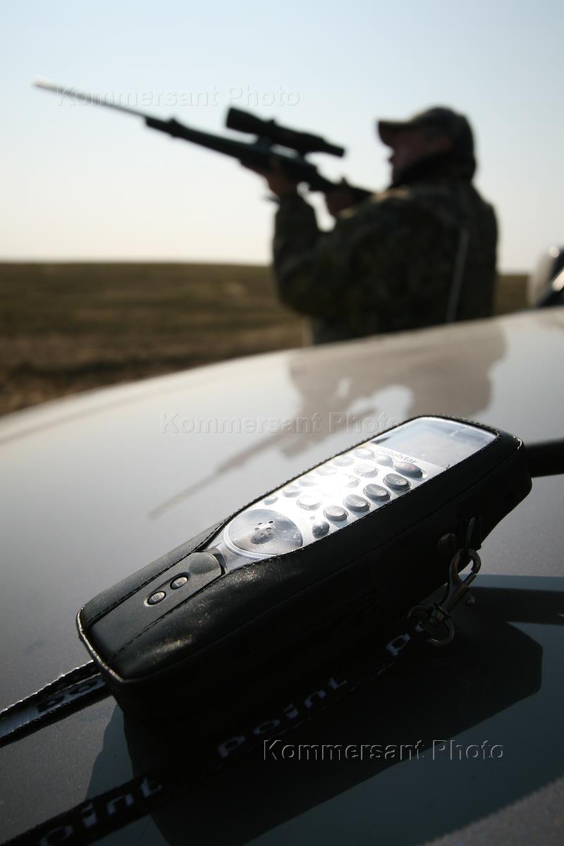 Жанровое фото. Охота на гуся в Оренбуржье. Охотник смотрит в оптический прицел.