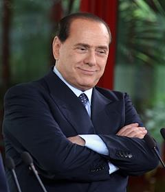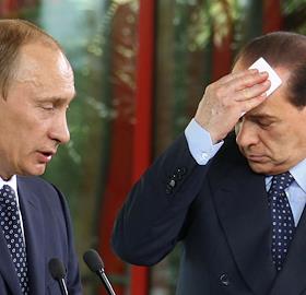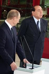 Визит Президента России Владимира Путина в Италию (остров Сардиния). Президент России Владимир Путин (слева) и лидер победившей на состоявшихся парламентских выборах коалиции "Народ свободы" Сильвио Берлускони (справа) во время совместной пресс-конференции на вилле "Чертоза".