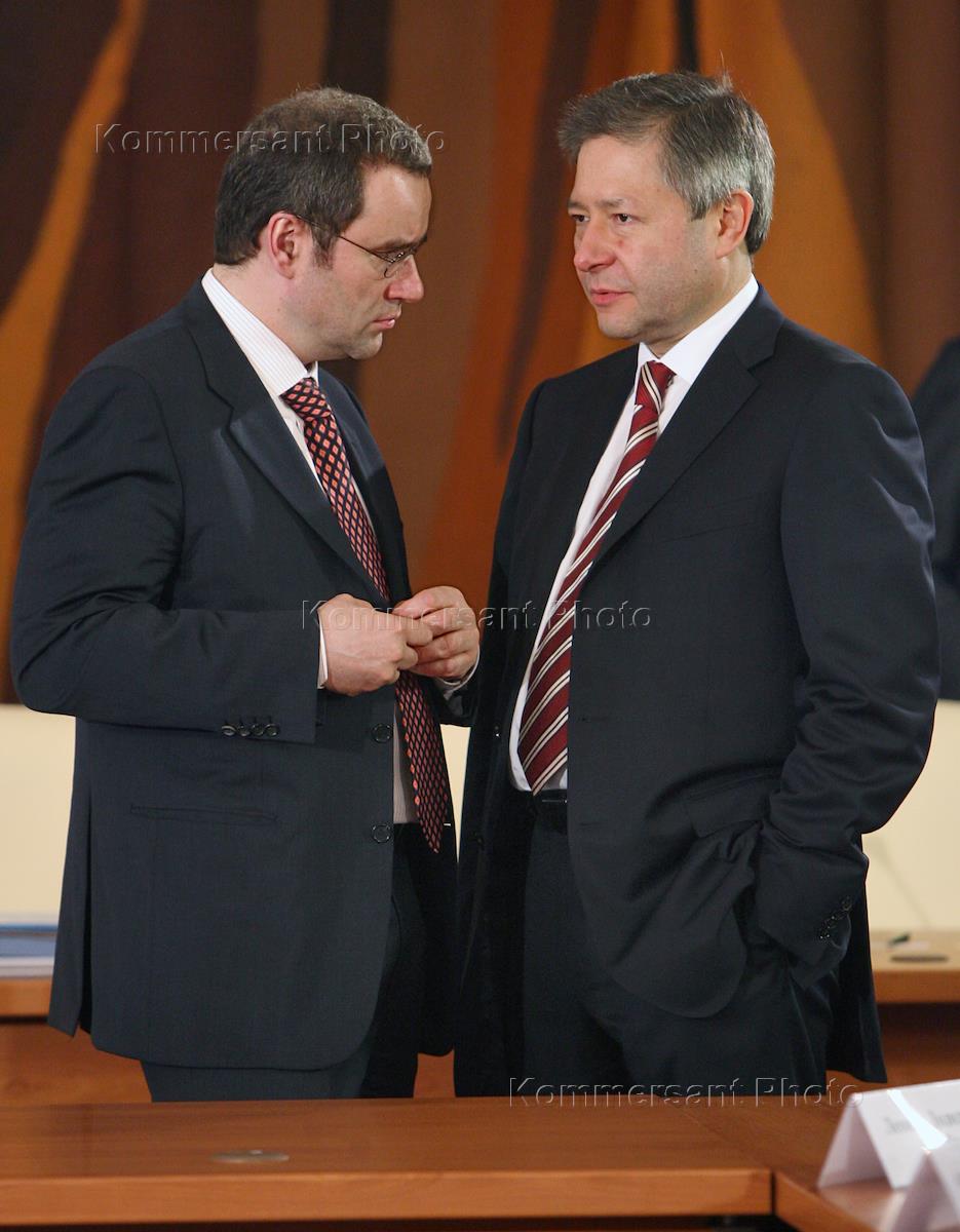 Министр по связи и информатике Леонид Рейман (слева) и заместитель председателя правительства России, министр финансов Алексей Кудрин (справа) перед началом заседанием Госсовета.