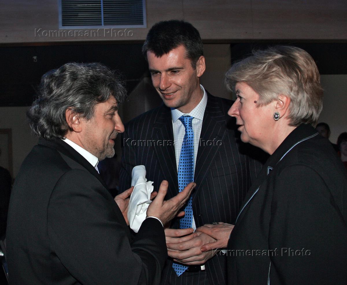 Советник руководителя Федерального агентства по печати и массовым коммуникациям Владимир Григорьев (слева), президент группы "ОНЭКСИМ" Михаил Прохоров (в центре) и представитель в Совете Федерации России от Государственного Собрания Республики Марий Эл Наталья Дементьева (справа) на праздновании дня рождения руководителя Федерального агентства по физической культуре и спорту Вячеслава Фетисова в "Форум-холле".