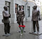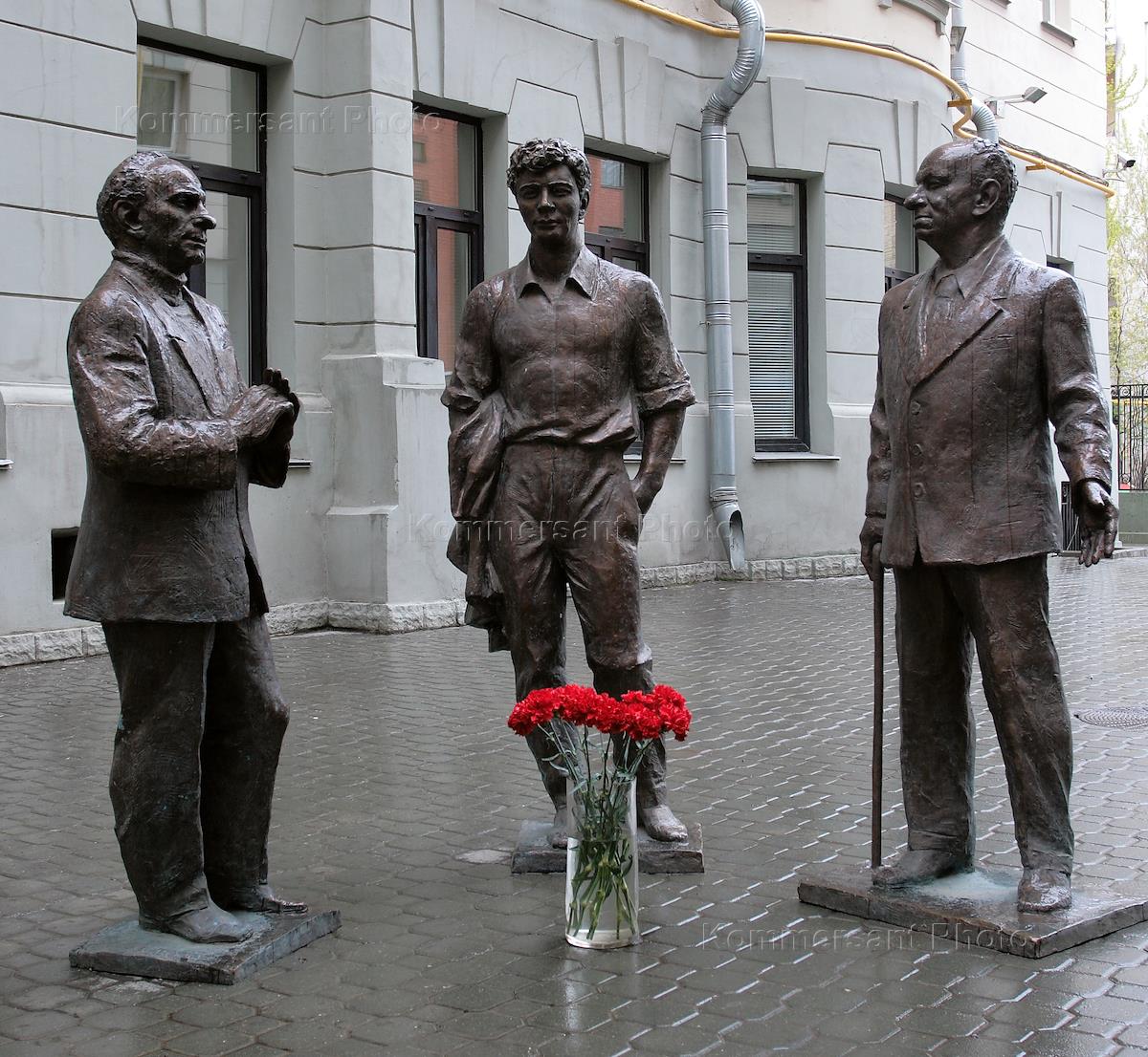 Скульптурная композиция, посвященная драматургам Александру Володину, Александру Вампилову и Виктору Розову, во дворе Московского театра п/р О. Табакова "Табакерка".