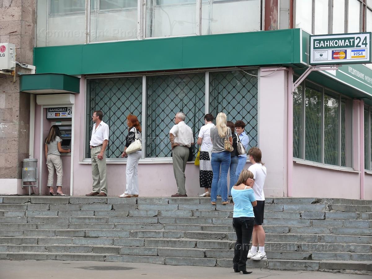 Банкомат Сбербанк России. Люди стоят в очереди, чтобы снять деньги.