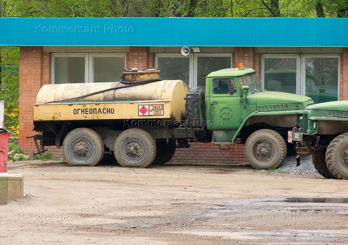 Автомобиль-заправщик "Урал" на старой автозаправке (АЗС) на окраине города. Надпись "Огнеопасно".