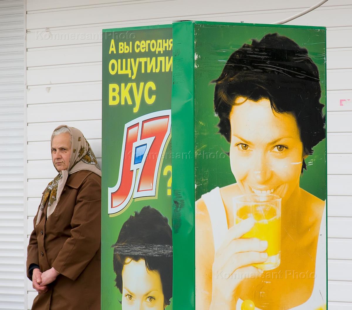 Бабушка пенсионерка стоит возле холодильника "J7" с надписью "А вы сегодня ощутили вкус "J7".