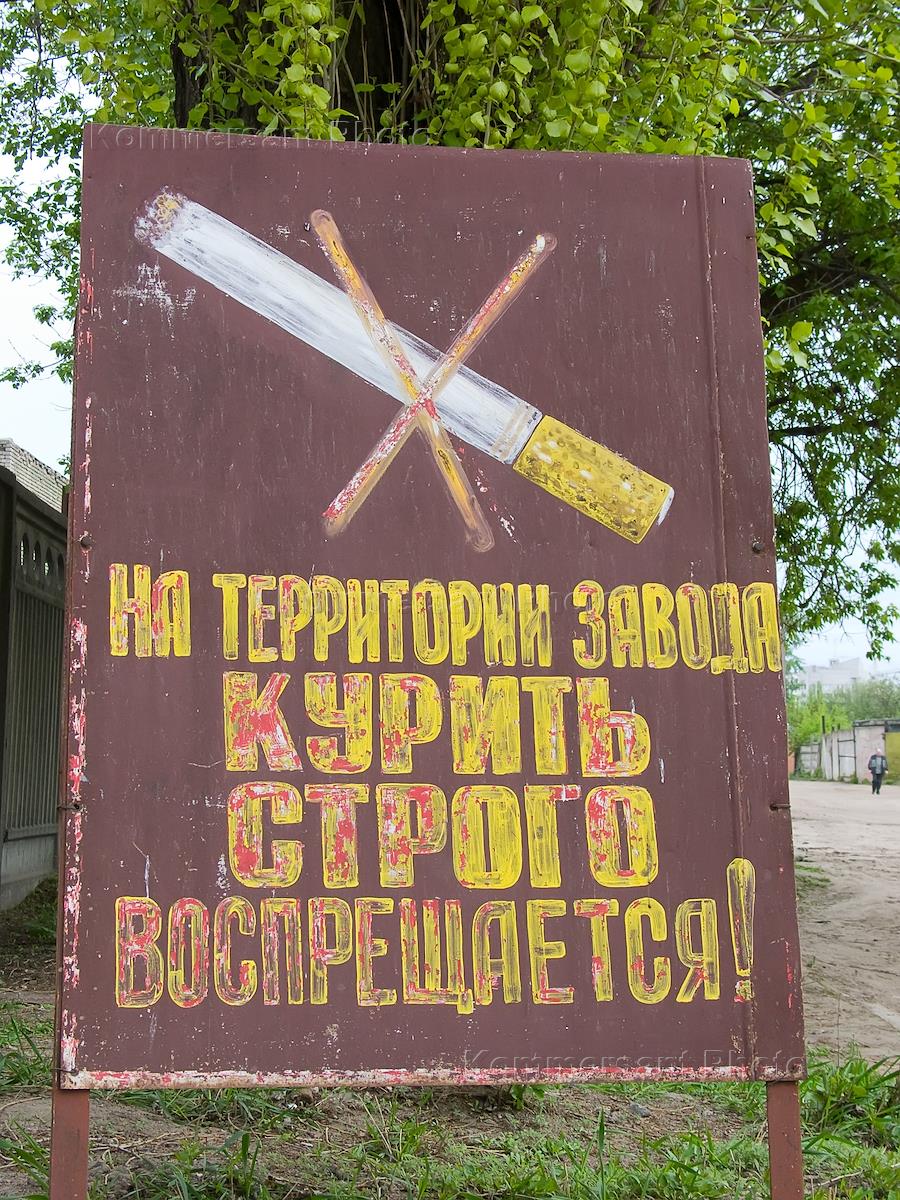 жанровая фотография. Щит с надписью "На территории завода курить строго воспрещается!" у здания проходной завода по производству минеральных удобрений.