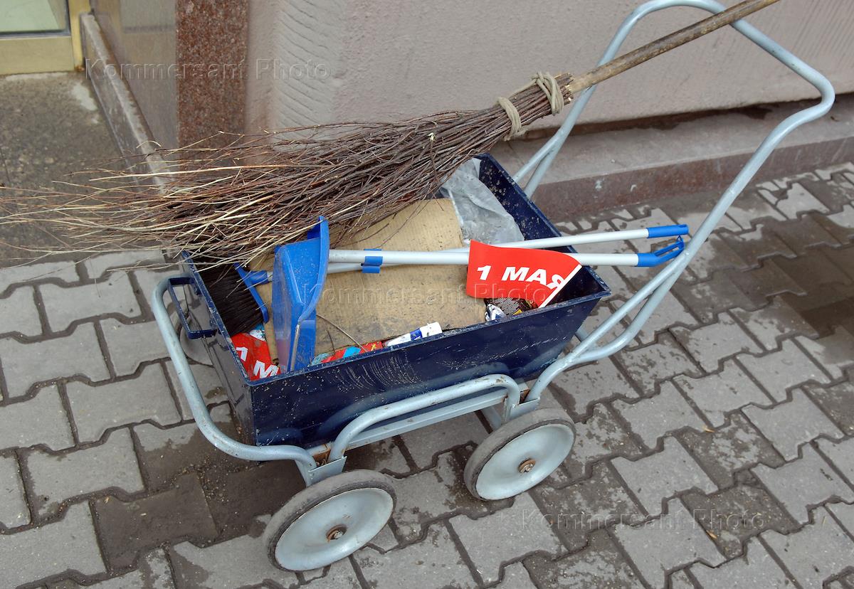 Уборка улиц после первомайских шествий. В коляске красный флажок с надписью "1 мая!" и инвентарь дворника: метла, совок.