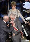 Торжественный концерт по случаю 75-летия доктора Леонида Рошаля . Директор Московского НИИ неотложной детской хирургии и травматологии, член Общественной палаты России Леонид Рошаль (справа) во время вручения ему медали "Символ Науки". Торжественный концерт прошел в Московском Международном Доме музыки.