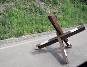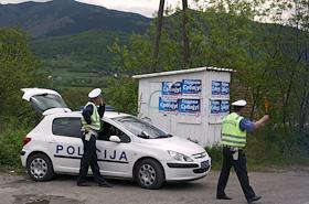 Пост дорожной полиции на въезде в город Митровицы в Косово.