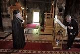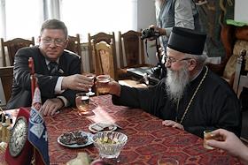 Епископ Рашко-Презренский Артемий (слева) во время посещения заместителем председателя Совета Федерации России Александром Торшиным (справа) Дечанского монатыря в Косово.