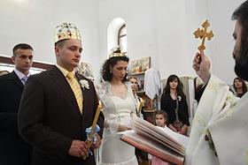 Сербская свадьба. Венчание молодожен в церкви города Звеган.