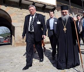 Епископ Рашко-Презренский Артемий (слева) во время посещения заместителем председателя Совета Федерации России Александром Торшиным (справа) Дечанского монастыря.