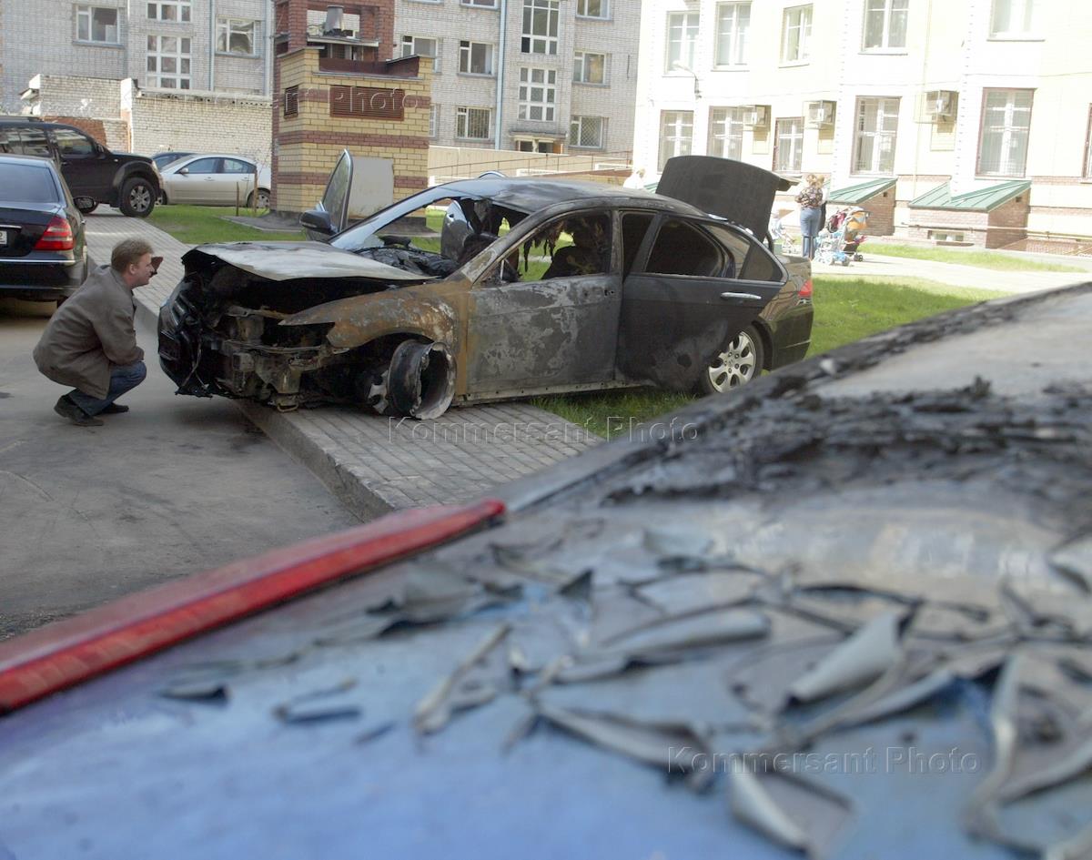 Ночью 9 мая неизвестные подожгли автомобиль "Porsche Cayenne", припаркованный во дворе жилого дома. Автомобили "Honda Accord" и "Nissan Note", сгоревшие в результате поджога вместе с "Porsche Cayenne". Сотрудник страховой компании осматривает место пожара.