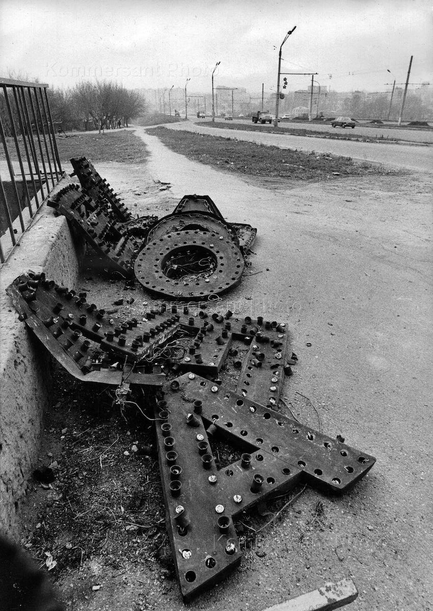 Разрушенная скульптура спортсмена на фоне жилого дома.
