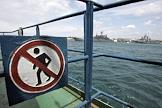 Запрещающий знак на ограде пристани. Военные корабли Черноморского флота России во время празднования Дня Победы в гавани города.