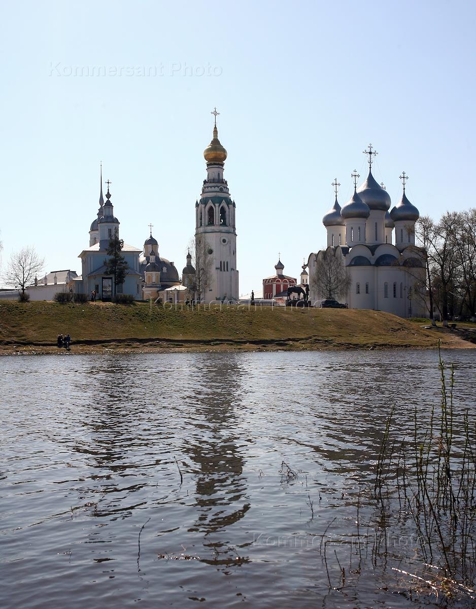Церковь Иоанна Златоуста (слева, за рекой) и Храм Святого Благоверного князя Александра Невского на территории Вологодского кремля.