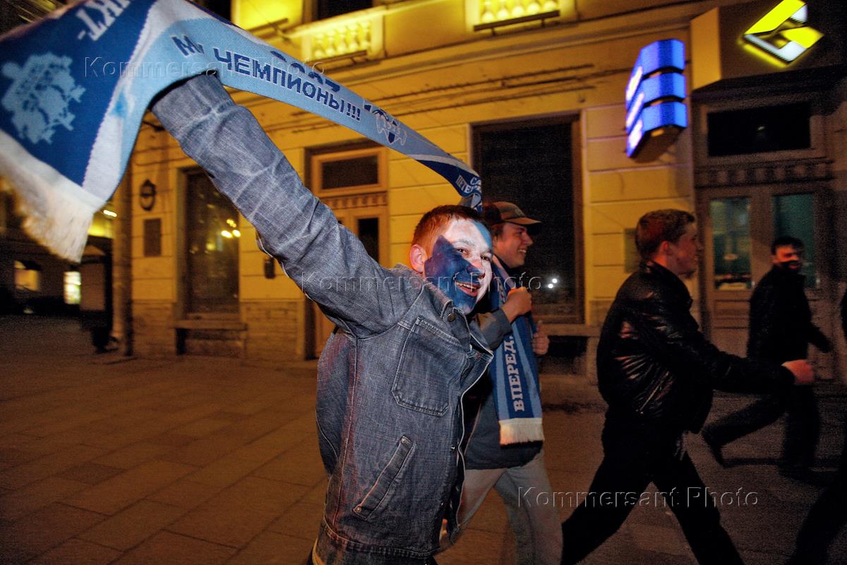 Празднование победы в барах и на Невском проспекте болельщиками ФК "Зенит" в Кубке УЕФА между командами "Зенит" - "Glasgo Rangers".