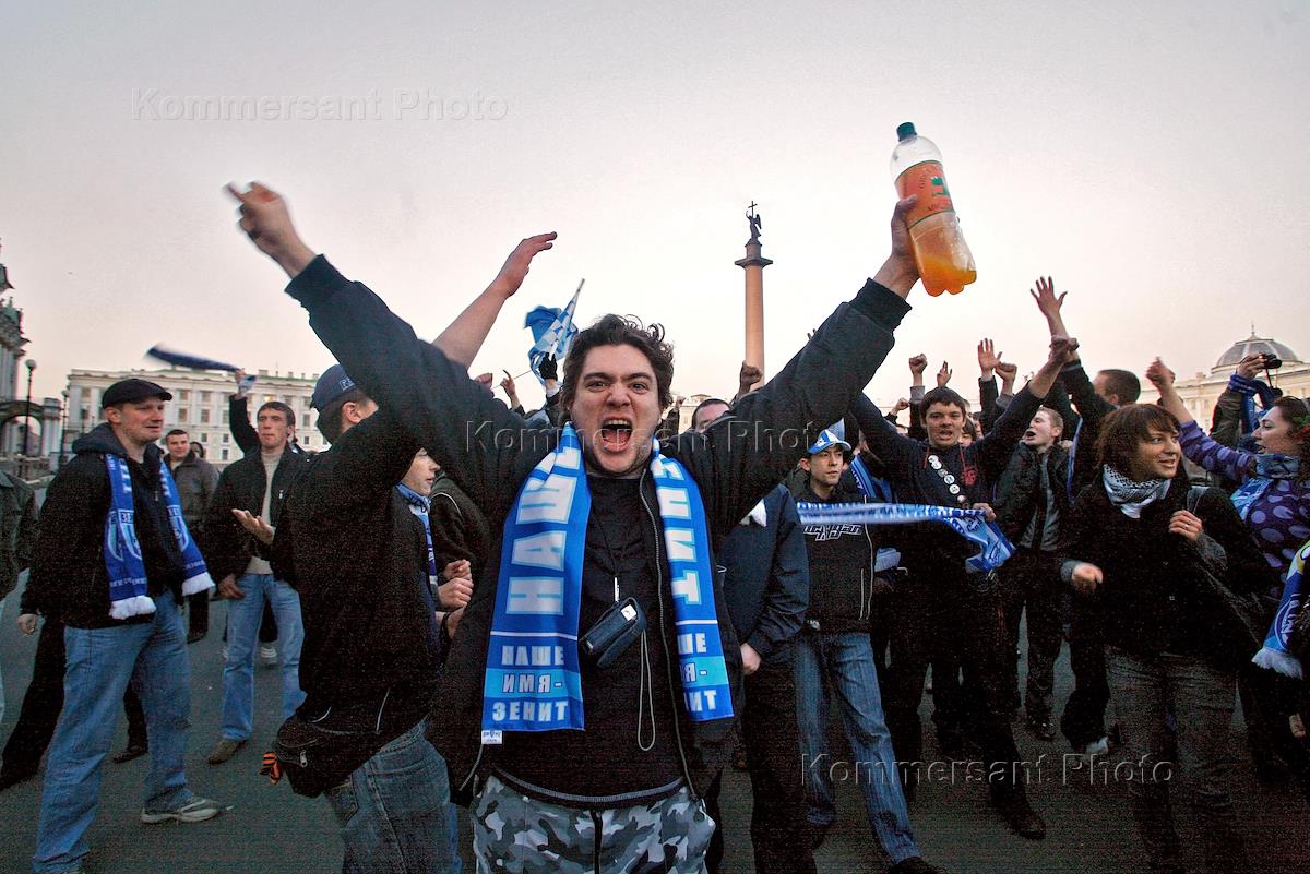 Болельщики (фанаты)футбольной команды "Зенит" на Дворцовой площади празднующие победу команды в кубке УЕФА.
