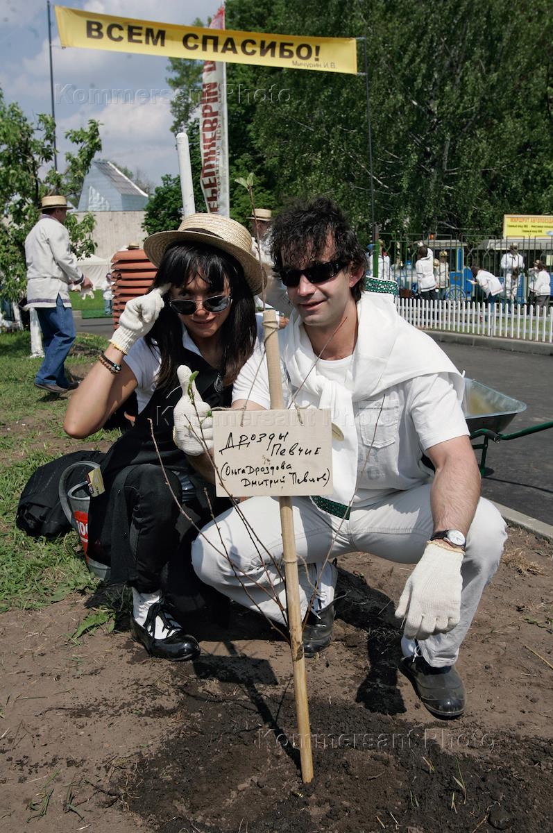 Актеры Ольга Дроздова (слева) и Дмитрий Певцов (справа) на традиционном воскреснике открытого фестиваля искусств "Черешневый леc" в Мичуринском саду Всероссийского выставочного центра (ВВЦ).