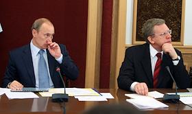 Председатель Правительства России Владимир Путин (слева) и министр финансов Алексей Кудрин (справа) во время заседания межведомственной рабочей группы Совета при Президенте России по вопросу "О ходе и перспективах реализации государственной программы развития сельского хозяйства на 2008-2012 годы".
